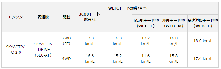 ■マツダ CX-3「SKYACTIV-G 2.0」搭載車*3 JC08モード燃費、WLTCモード燃費は以下のとおり