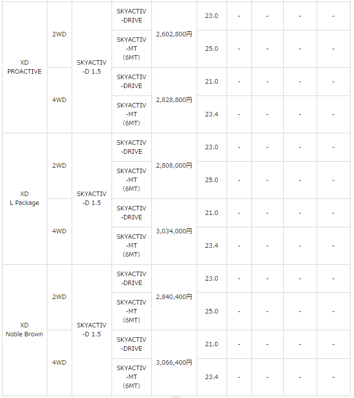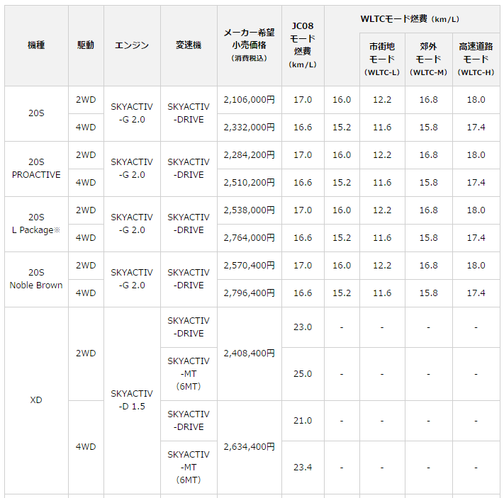 今回の改良において、新世代ガソリンエンジン「SKYACTIV-G 2.0」車を新たに設定。新世代クリーンディーゼルエンジン「SKYACTIV-D 1.5」車に加え、お客さまに新たな選択肢を提供する。ガソリンエンジン車は、2018年10月以降に表示が義務化される燃費モード「WLTCモード」*3の認可を先行して取得。実際の使用実態を踏まえた燃費性能の向上に、今後も取り組んでいく。