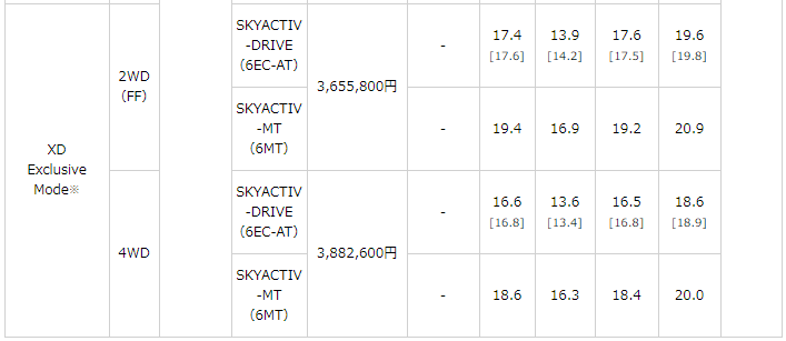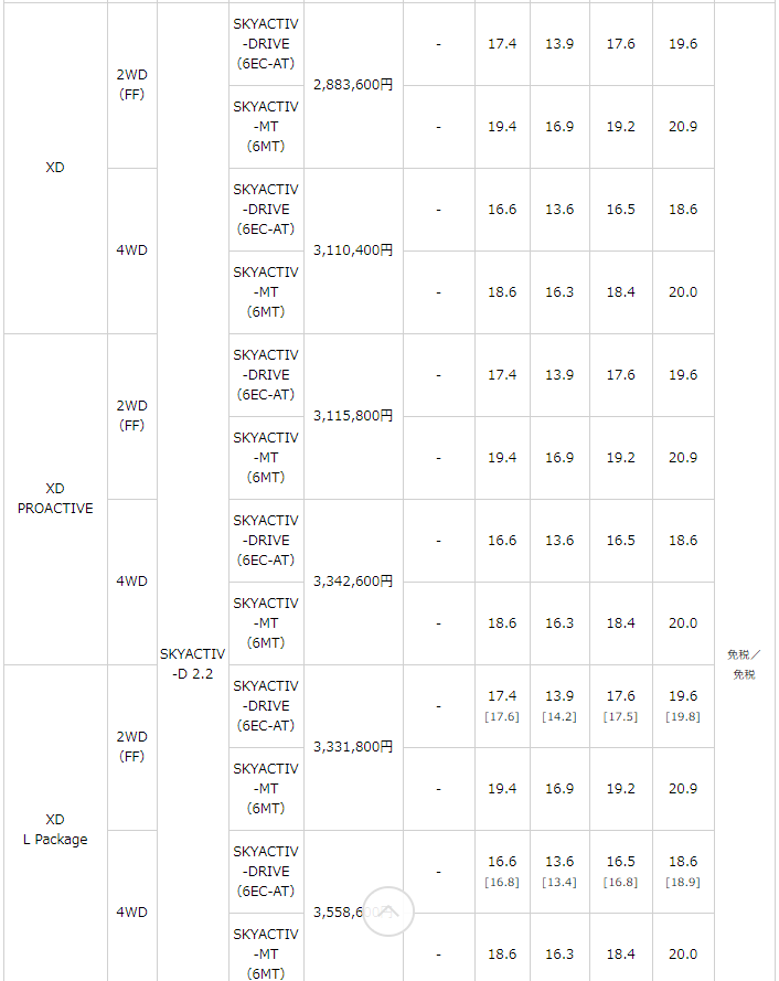 - [ ] 内は、XD L packageおよびXD Exclusive Mode(それぞれ6EC-AT車)のメーカーセットオプション 「i-ELOOP(アイ・イーループ)装着車」の場合。「i-ELOOP」は64,800円(消費税込)高。