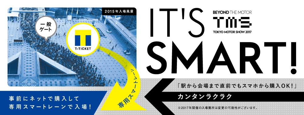 Tチケットが初めて導入された前回開催の「東京モーターショー2015」では、入場ゲートで並ばずにスムーズにチェックインできる“Tチケット専用ゲート(スマートレーン)”が多くの来場者に好評を得たこと受け、今回の「東京モーターショー2017」においても「Tチケット」の特典として専用スマートレーンを提供いする。「Tチケット」で前売券もしくは当日券をご購入の方は、一般ゲートではなく「Tチケット」の専用ゲートから入場することができる。