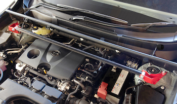 「BATTLEZアルカーボンタワーバー」は、ボディー剛性を高め回頭性の向上に効果的。アルミオーバルチューブに、リアルカーボンを焼付けた質感が、エンジンルームにアクセントを加えて、スポーツマインドを掻き立ててくれる。