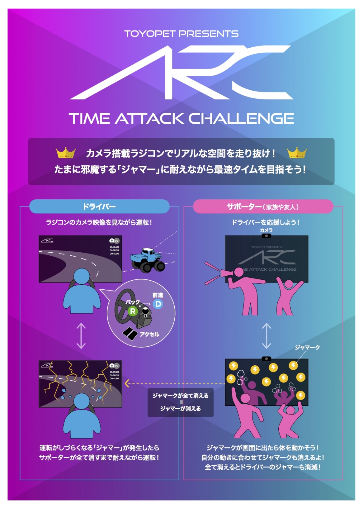 ドライバーの家族や友人は、ジャマーが発生したら出てくる「ジャマーク」をカメラに映る自分の動きで全て潰して、ドライバー側の「ジャマー」を消滅させて助ける。