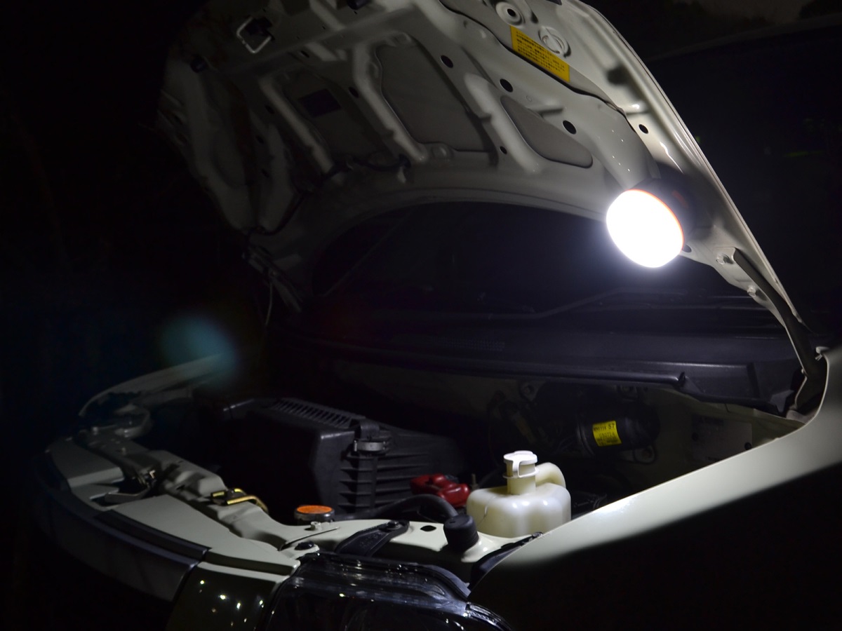 カラビナフックで、ひもや枝に引っ掛けることができるほか、ランタン天面部に内蔵されたマグネットで、車のボンネットやスチール棚に取り付けでき、様々な場所で自由に使える。