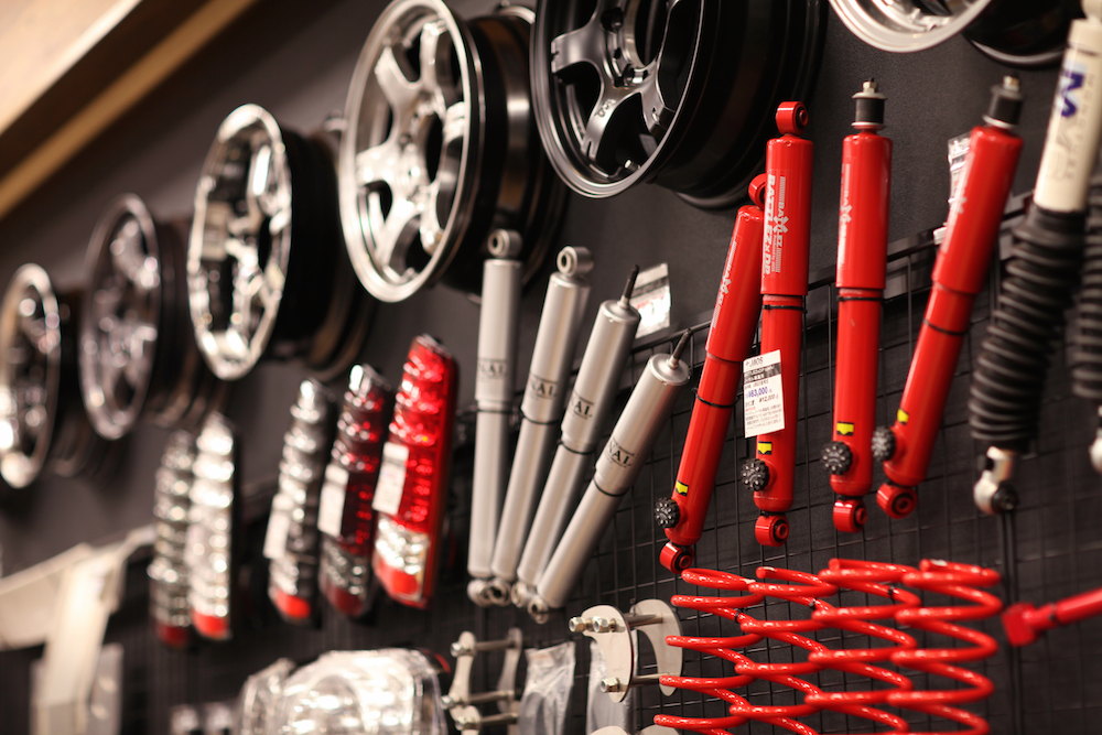 店内奥の壁には、クルマのパーツを多数展示。間近で見て触れ、自分流のクルマ創りがより鮮明にイメージされることだろう。