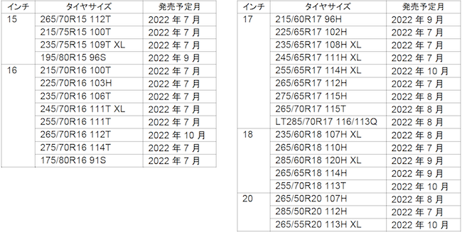 また、降雪時における性能も向上し、圧雪路でのブレーキング性能が同社従来品(OPEN COUNTRY A/T plus)比で13%向上、「スノーフレークマーク」の要件も満たし、季節を問わず活躍が期待出来る仕上がりとなっている。