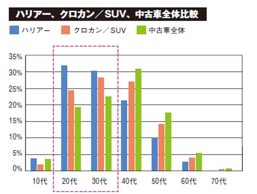 下のグラフはハリアー、クロカン/SUVカテゴリーのクルマ、中古車全体の問い合わせの割合を年代別に表したもの。クロカン/SUVカテゴリーは中古車全体と比べても若い世代からの問い合わせが多いですが、その中でもハリアーは20~30代からの多さが際立つ。ハリアーユーザーに行ったアンケート結果やカーセンサーnetに寄せられたクチコミによると、多くのユーザーが内外装のデザインに言及しており、ハリアーの上品で高級感のあるデザインが特に20~30代の心を捉えていると考えられる。
