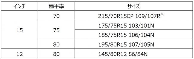 発売サイズはキャンピングカー向けタイヤの専用規格であるCP規格(※)に適合した215/70R15CP 109/107Rを含む5サイズで、価格はオープンプライス。