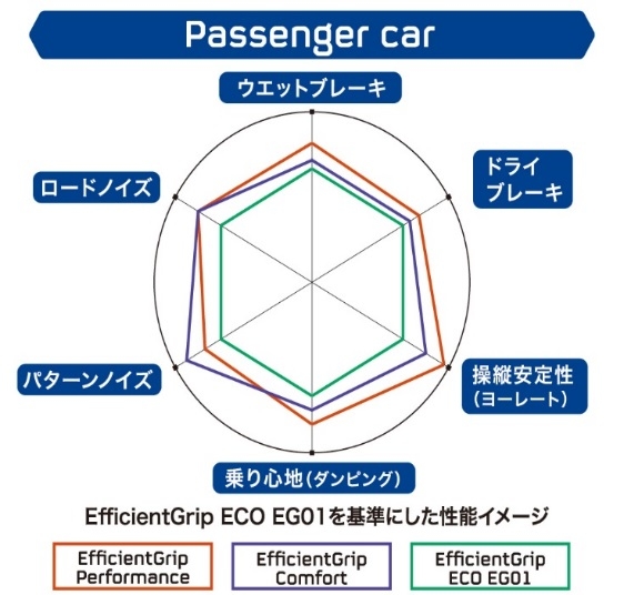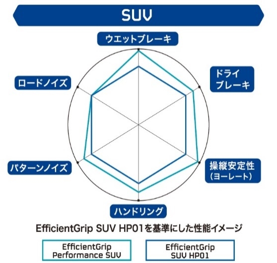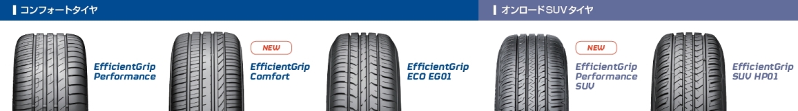 E-Grip Performance SUVは併売するE-Grip SUV HP01以上のオンロード性能を持つハイパフォーマンスSUVタイヤ。ルクセンブルグ・イノベーション・センターで開発されたアジアパシフィック地区への戦略製品で、拡大し続けるSUVマーケットへ訴求していく。サイズ数は25サイズ。価格はオープン価格。