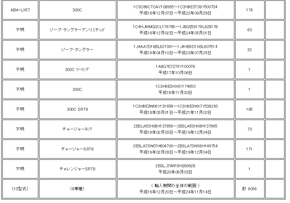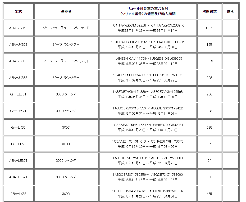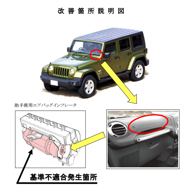 ジープ ラングラー/クライスラー 300C/ダッジ チャージャー 助手席・エアバッグリコール