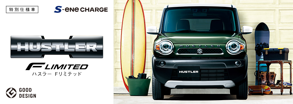 ハスラー 特別仕様車「Fリミテッド」は、Gグレードをベースに、内装はカーキ色の専用シート表皮を採用し、外観はガンメタリック塗装のフロントバンパーガーニッシュとリヤバンパーガーニッシュ、黒色のスチールホイールなどを装着し、アクティブで引き締まった印象とした。車体色はオレンジ×黒の2トーン、ホワイト×黒の2トーン、イエロー×白の2トーンの専用色を含む全4色の設定とした。さらにステレオカメラ方式の衝突被害軽減システム「デュアルカメラブレーキサポート」をメーカーオプション設定することで安全装備を充実させた。