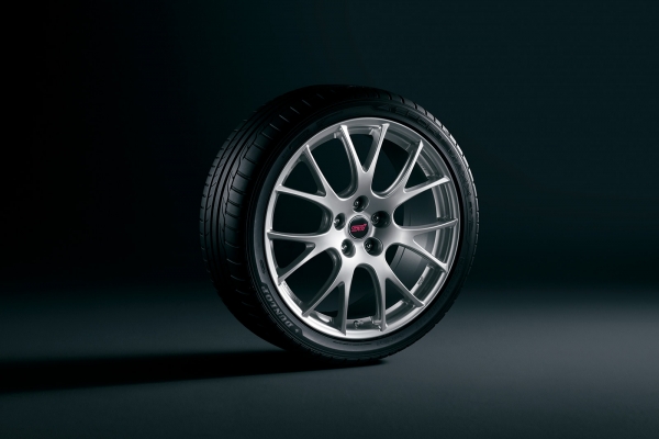 エクステリアはSTI製BBS19インチ鍛造アルミホイール(シルバー)をはじめ、メッシュタイプフロントグリル(チェリーレッドストライプ、STIオーナメント付)、大型フロントアンダースポイラー、ブラックルーフアンテナ(シャークフィンタイプ)、STIオーナメント付サイドガーニッシュ、チェリーレッドストライプ入りリヤバンパーを専用装備。鍛え上げられたアスリートのように美しく、機能的なスタイリングとした。