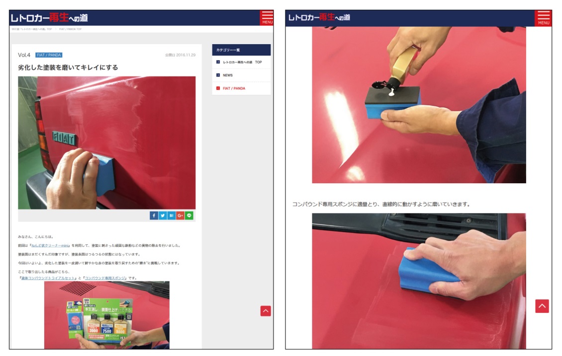 特設コンテンツ内にて、名車を補修していく様を、パーツや作業工程ごとに切り分けてわかりやすく紹介。 DIY補修についてのご理解をより一層深められる。