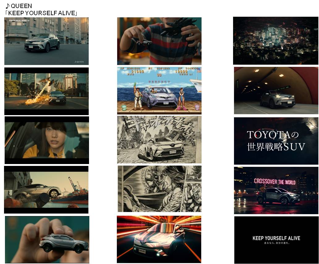 今回のCMは「CROSSOVER THE WORLD」というテーマのもと、「映画」、「おもちゃ」、「ゲーム」、「マンガ」、「アニメ」といった様々な世界をC-HRが走りに抜けていく爽快感溢れるCMとなっている。