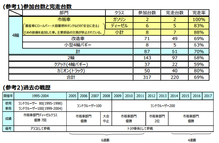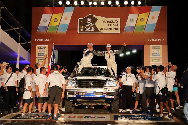 トヨタ⾞体、ダカールラリー2017で ゼッケン ナビゲーター ドライバー 順位 ディーゼルクラス*1 総合 ワン・ツーフィニッシュにより市販⾞部門4連覇を達成!
