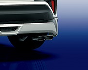 スクエアデュアルマフラーカッターが迫 力ある佇まいを演出する。 【サイズ】100 ㎜×50 ㎜スクエアデュアル 【設定】全車 ※除く、リヤスカート(BOOST IMPULSE STYLE)装着車