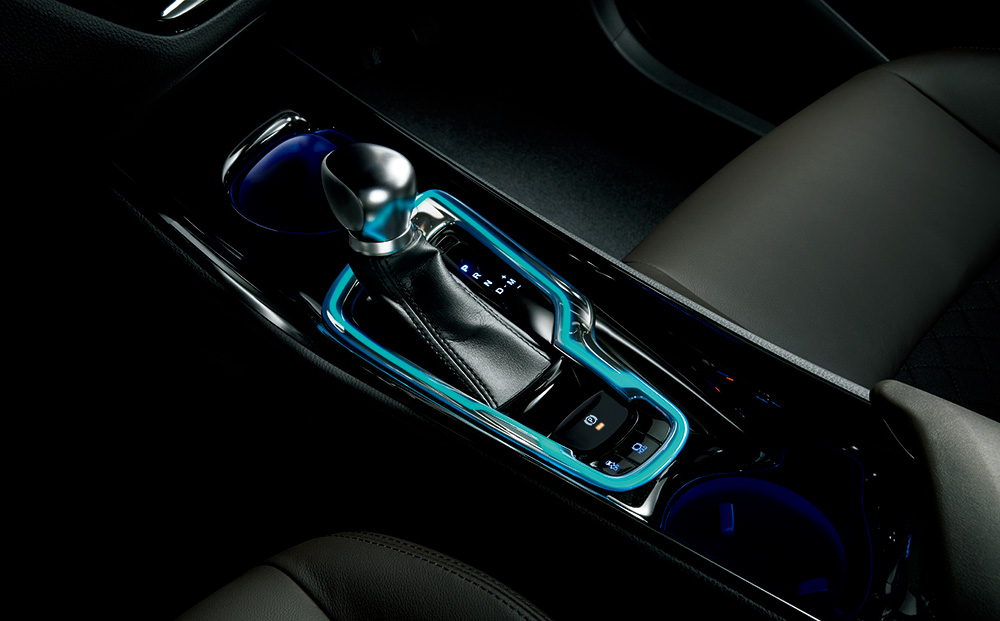 メッキ調のシフトベースフィニッシャーに 無機ELを内蔵したイルミネーションアイテム。クリアランスランプ連動でメッキ調 の表面を透過するようにライン状に面発光 し、航空機のコックピットを思わせるメカ ニカルで未来感あふれるインテリア空間を演出。 【設定】全車