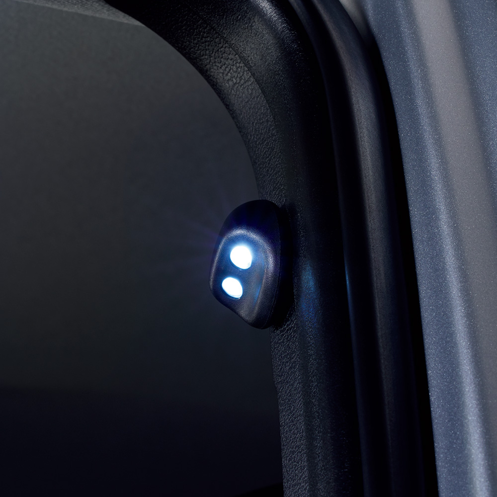 センターピラーの前方に取付ける小型 LED ライト。丸みを帯びた愛らしいデザインでインテリアに溶け込み、双眼レン ズからホワイトビームが広角に足元を照 射し夜間の乗降にも安心。 運転席・助手席それぞれのドア開閉に連動して点灯し、おもてなし感を演出。左右の 2 個セット。 【設定】全車 ※照射部の画像は当該車両とは異なる。