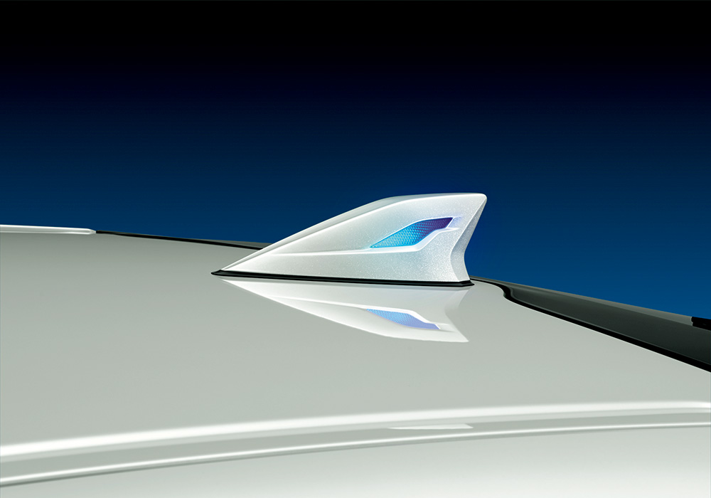 シャープで独創的なデザインのフィンタ イプのアンテナにクリアランスランプ連 動の LED ランプを内蔵し、先進的なエク ステリアを演出する。 【設定】全車