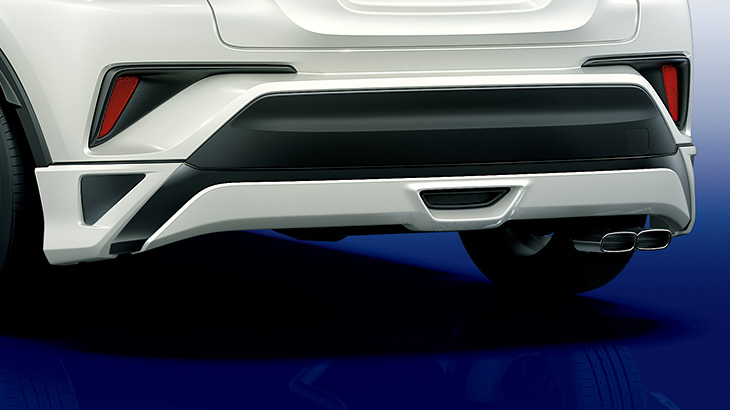 ブラックアウトされた門構えのデザイン が、踏ん張り感のある安定したスタンスを 創出。下側にはフロントデザインとシンク ロしたディフューザー形状と、ビルトイン マフラーをイメージさせるスクエア形状 の金属調ガーニッシュにより、未来感のあ るダイナミックでスポーティなリヤスタ イル演出する。 【設定】全車 ※除く、マフラーカッター装着車