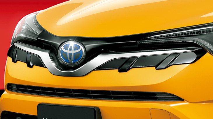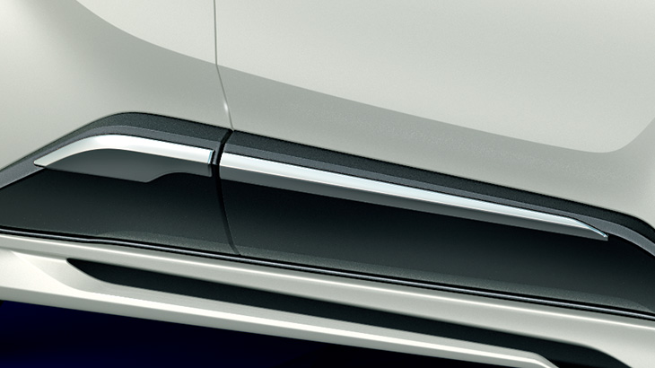 ウイング状のメッキ加飾が左右に伸び、ワ イド感あふれる個性的な表情を創出。左右 には立体造形を施したブラックアウト面 が加わり、ダイナミックでスポーティな印 象を高める。 【設定】全車