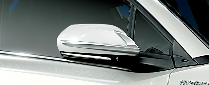 ドアミラーカバーにクリアランスランプ 連動の LED イルミネーションを内蔵。 シャープなアウトラインで構築された デザインが、スタイリッシュで先進的な エクステリアを演出する。 【設定】全車 ※除く、クールシャインキット、 ミラーガーニッシュ装着車