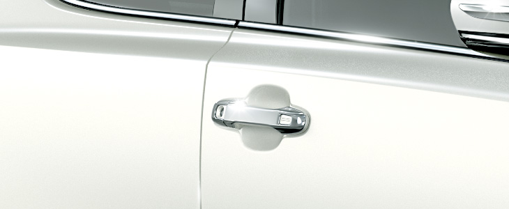 ドアハンドルに被せるタイプのメッキガ ーニッシュ。メッキの輝きが高級感を演出する。 【設定】全車