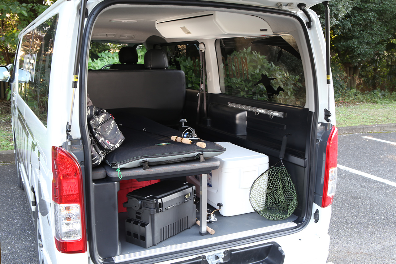 「モデリスタエアロキット」「クールシャインキット」「ロッドホルダー」などを装着した車両。 「ロッドホルダー」でラゲージスペースに愛用ロッドも安心して収納でき、ラゲージスペースもたっぷりと フル活用が可能。