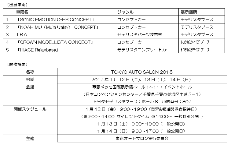 また、モデリスタWEBサイトでは、既に東京オートサロン特設サイト(www.modellista.co.jp/event/as2018/)を開設しており、今後もモデリスタブースに関する情報を随時更新していく。