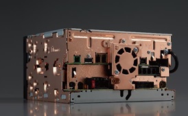 本機は、国内市販AV一体型カーナビゲーションとして初めて銅メッキシャーシを採用している※1。製品の側面と背面だけでなく、内部の中間シャーシにも銅メッキを使用することで、カーナビ基板とオーディオ基板の間のノイズを徹底的に遮断。さらに、製品右側面へ集中的に銅メッキビスを使用することで、オーディオブロックへ回り込まないようにノイズの流れをコントロールしている。