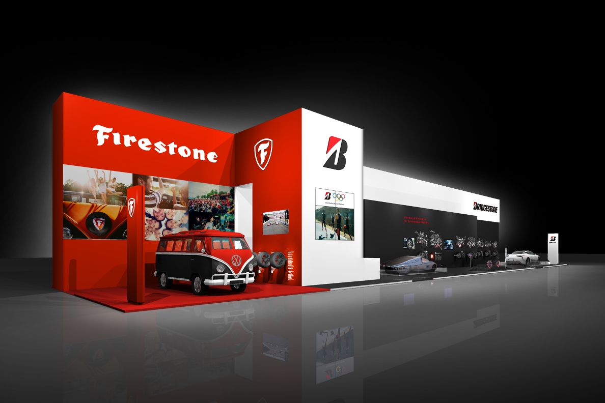 ・ファイアストンのブランドヒストリーや欧州向けに販売しているタイヤ製品を展示します。「信頼・伝統」を軸にグローバルに展開するファイアストンブランドの世界観を表現している。