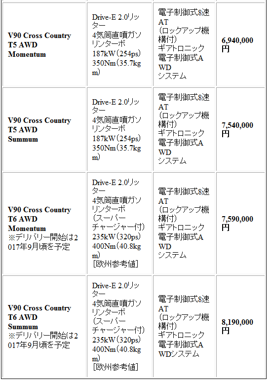 新型V90 Cross Countryシリーズ 車両本体価格V90 2