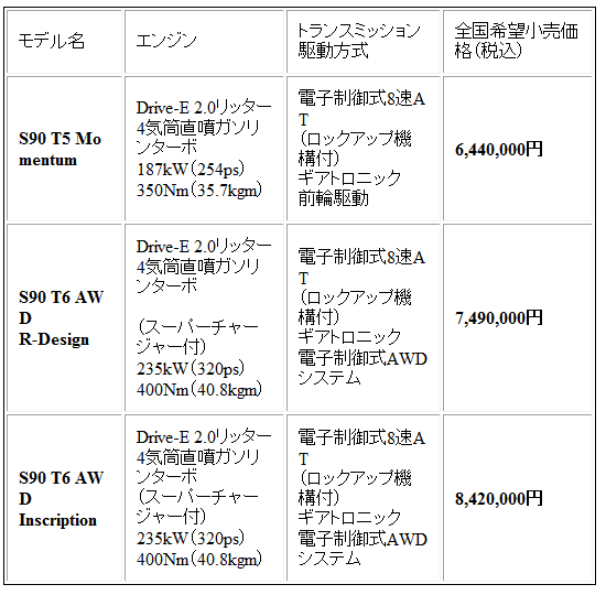 新型S90は、ボルボS80の後継となるモデルです。内側にカーブした特徴的なグリルはボルボP1800をオマージュしたもの。クーペを思わせる流麗なスタイリングに、快適な室内空間と高い安全性を備えた、ボルボのフラッグシップ・セダンです。装備・仕様の違いにより、「Momentum(モメンタム)」「R-Design」と「Inscription」の3グレードを用意。新世代パワートレーンDrive-E (ドライブ・イー)は、 2.0リッター4気筒直噴ターボ「T5」、 2.0リッター4気筒スーパーチャージャー付き直噴ターボ「T6」エンジンを搭載し、新開発の高効率な8速ATと、「T6」には電子制御式AWDシステムを組み合わせます。 S90は500台の限定発売となります。