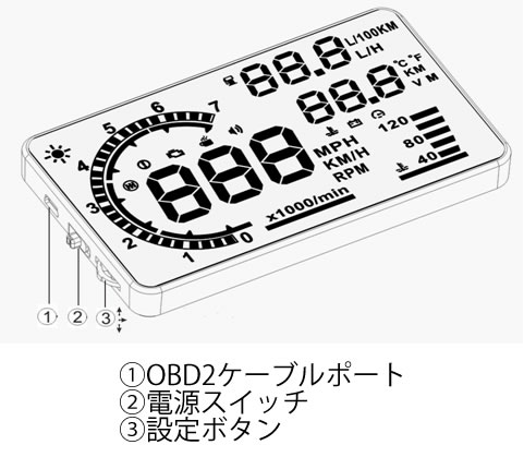 フロントガラスに速度、回転計、水温、バッテリー電圧、燃費等の多彩な情報を映し出す。