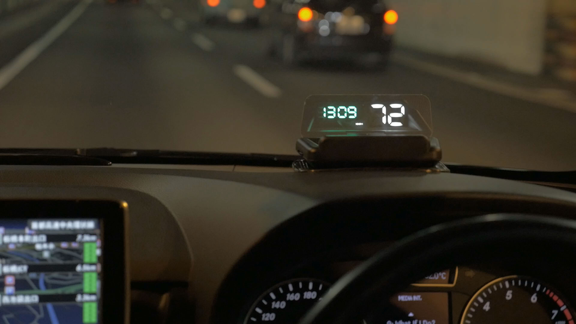 運転視界に 速度計/回転計/水温計/バッテリー電圧/時計 等、多彩な情報を投射表示。走行時の視線移動が減り、見慣れた車窓風景が まるで近未来SF のように変わる!