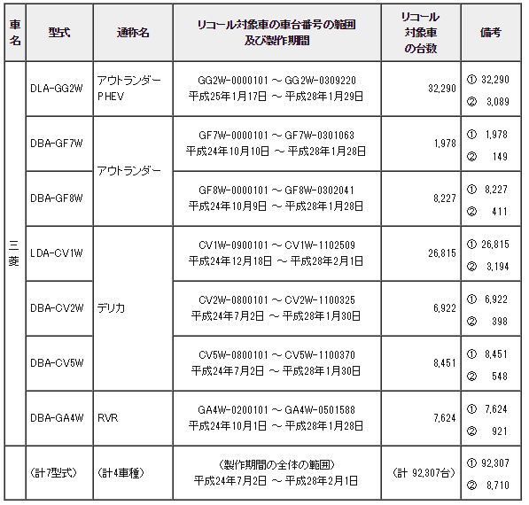 三菱自動車、アウトランダー、アウトランダーPHEV、デリカD:5、RVRの駐車ブレーキ、リコール