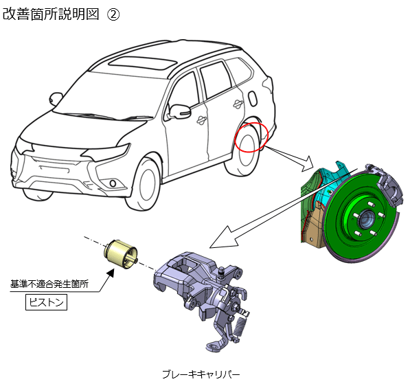 ② 後輪のブレーキキャリパーにおいて、製造工程での検査不良により検査規格を外れる部品が流出したため、 ブレーキパッドとブレーキディスクとの隙間を自動調整する機構が作動しなくなるものがある。 そのため、ブレーキパッドの摩耗が進行しても、ブレーキパッドとブレーキディスクの隙間が自動調整されず、 駐車ブレーキの制動力が低下し、最悪の場合、駐車中の車両が動き出すおそれがある。