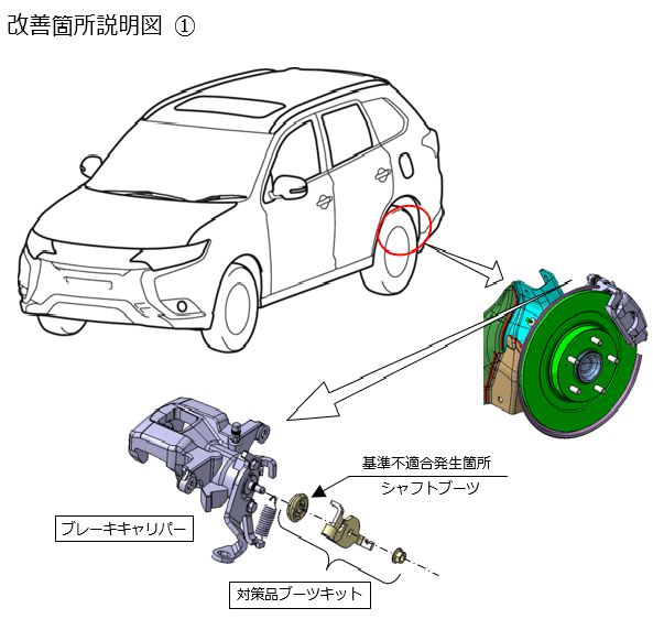 ① 後輪のブレーキキャリパーにおいて、 駐車ブレーキ駆動用シャフトのブーツのシール性能が不足しているため、シャフト部に水が浸入し、 シャフトに錆が発生することがある。 そのため、そのままの状態で使用を続けると、シャフトの錆がキャリパー内部まで進行しシャフトの回転が阻害され、 駐車ブレーキの制動力が低下し、最悪の場合、駐車中の車両が動き出すおそれがある。