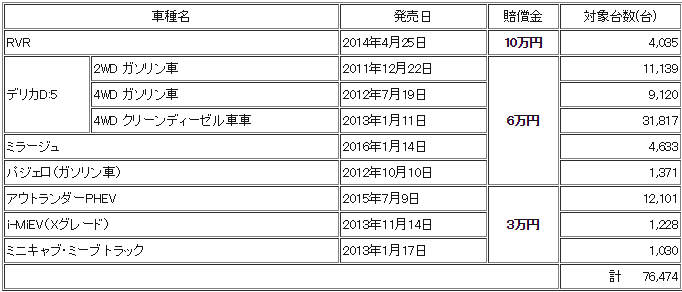 ※6月17日に公表した「登録車5車種の一部年式・型式の改ざんの不正」対象である『RVR』、『パジェロ』については、これまでの一時金3万円から、今回の賠償金のお支払いに切り替えます。