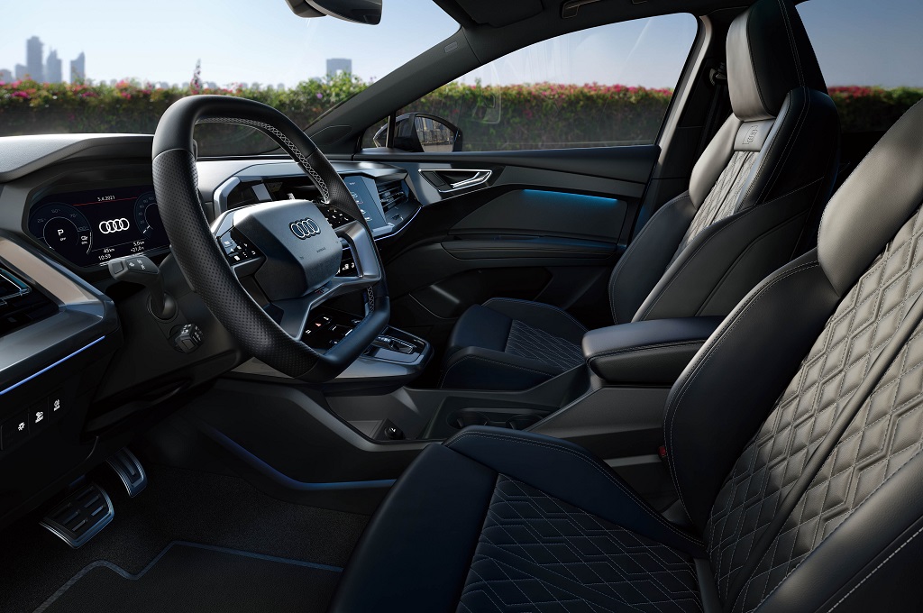さらに、空力性能にも注力しており、電動開閉式の冷却エアインレットやフロントスポイラーに対し垂直に配置されたディフレクター、空力性能を最適化したデザインのエクステリアミラーハウジング等により、Cd値はSUVモデルであるにもかかわらず、「Q4 e-tron」が0.28、「Q4 Sportback e-tron」は0.26を実現した。