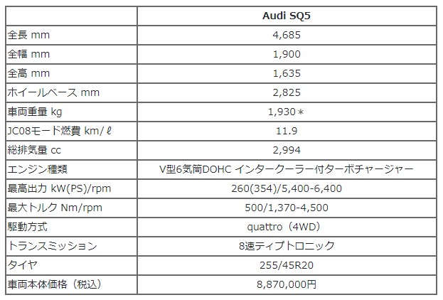 今回発売するAudi SQ5のモデルと価格(消費税込)は以下のとおり。