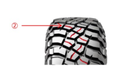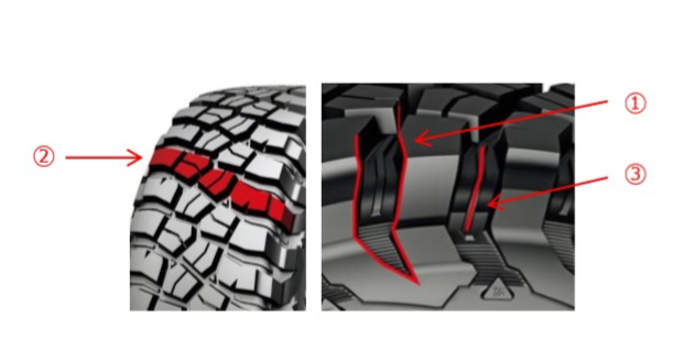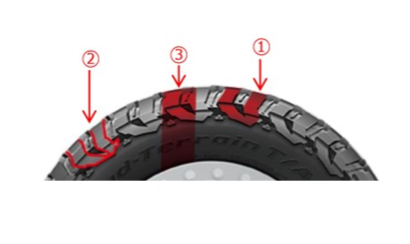 (1) ロック・グリップ トレッドコンパウンド=岩場や滑りやすい路面で強力なグリップを確保。