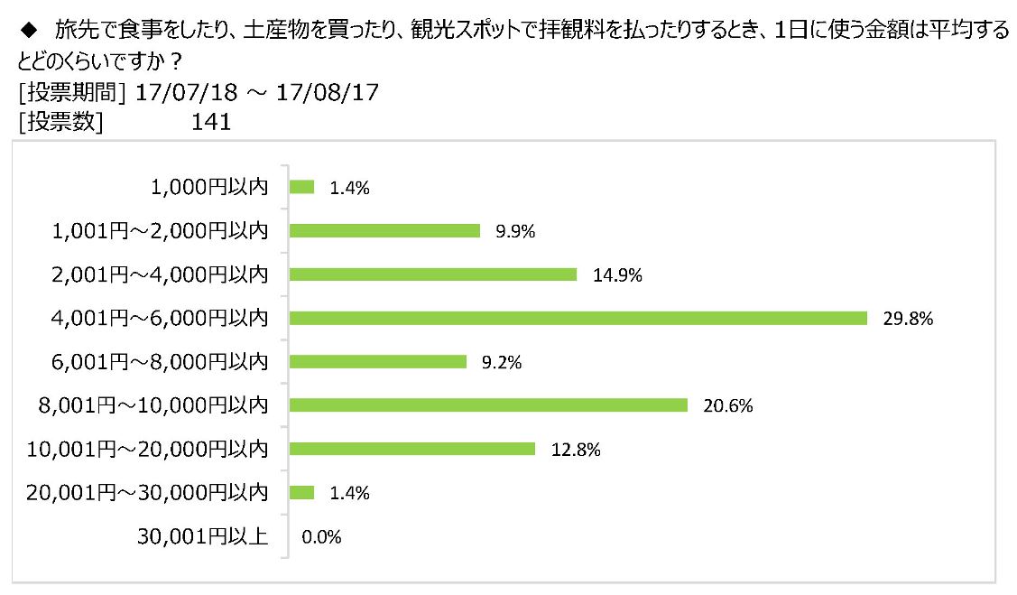 キャンピングカーユーザーが旅先での食事や土産物の購入等に支払う1日あたりの金額の平均額について一番多かった回答は、「4,001円~6,000円以内」という回答で、全体の29.8%を占めた。それに続いたのは「8,001円~10,000円以内」(20.6%)という回答だった。