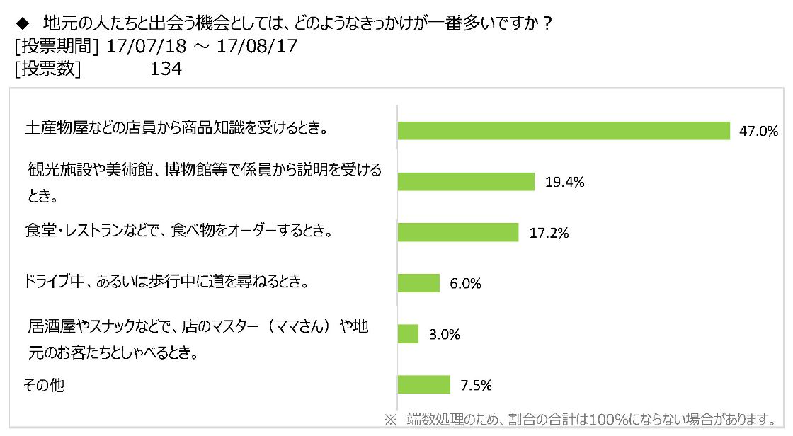 地元の人たちと会話を交わすきっかけとしていちばん多いのは、「土産物屋などの店員から商品知識を受けるとき」というもので、回答率は47.0%に達した。次に多かったのは、「観光施設や美術館・博物館等で係員から説明を受けるとき」(19.4%)。3番目は「食堂・レストランなどで食べ物をオーダーするとき」(17.2%)となった。