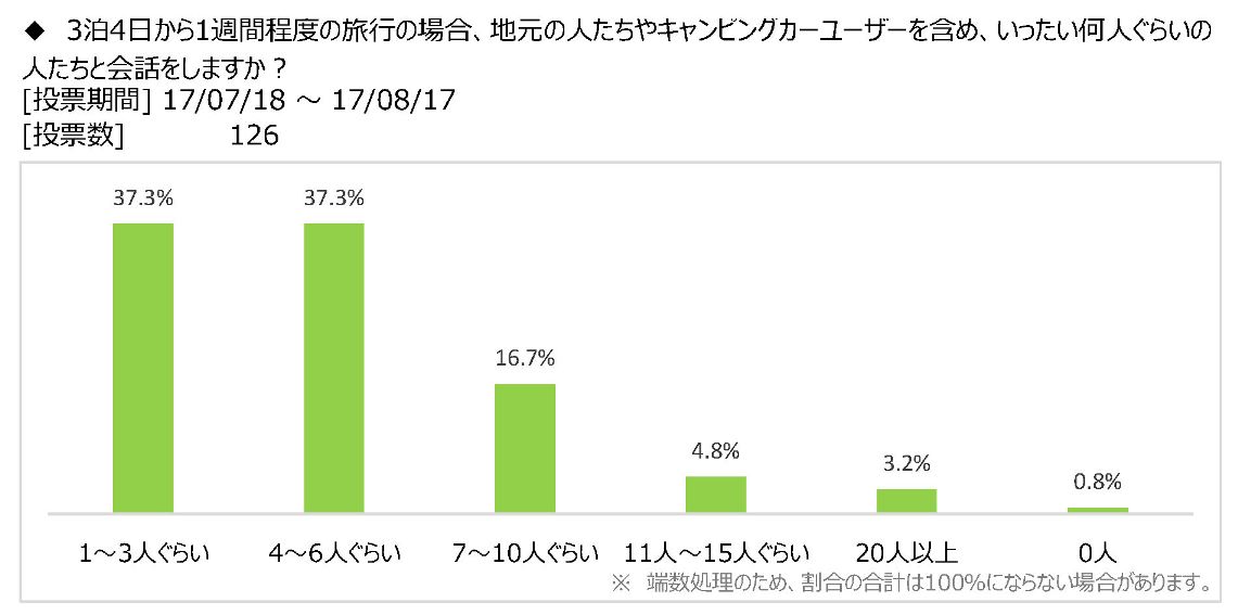 最後に、「3泊4日から1週間程度の旅行の場合、地元の人たちやキャンピングカーユーザーを含め、いったい何人ぐらいの人たちと会話をしますか」という問を設けてみた。