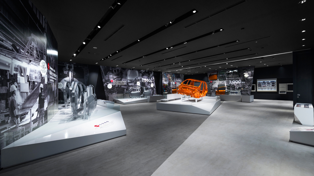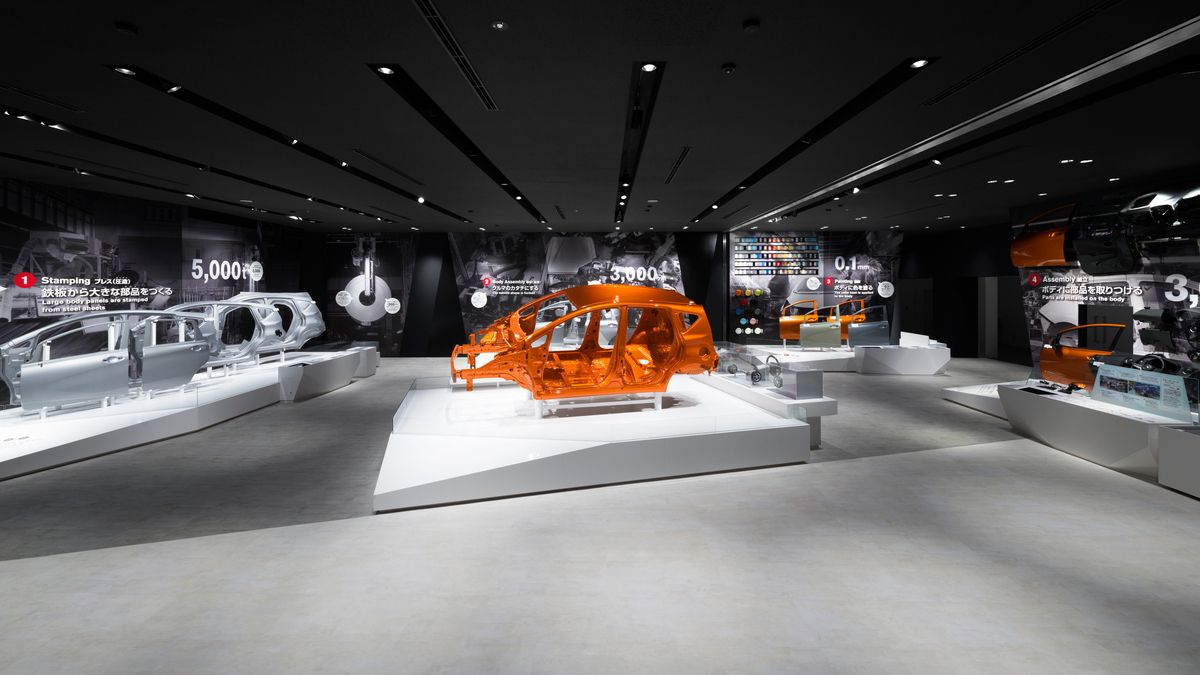 展示ホールは、「プレス」、「車体組み立て(溶接)」、「塗装」、「車両組み立て」、「検査」の5つの工程を、作業場面を切り取ったフレームのような展示ステージで構成している。それぞれのステージでは実物を展示し、触れて体験できるものもある。