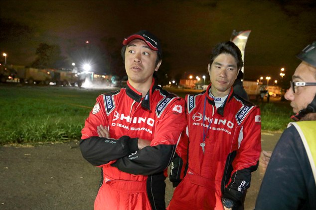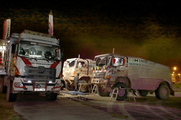 10日、SS終了後にアシスタンスルートでサルタに向かっていた日野チームスガワラの日野レンジャーは通行止め地点の北側から西方に回り込む約200㎞の迂回路を経由してサルタのビバークへ。2号車が到着したのが午後11時半ちかく、1号車は午前1時頃であった。迂回路の分岐点近くでビバークした車両も多く、サルタにはその時点でも車両は少なかった。翌日のキャンセルは伝わっていたが、日野チームは常に車両をベストな状態に保つべく、相次いで到着したアシスタンス車両/トラックが照明をともして粛々と日野レンジャーの点検整備を行った。