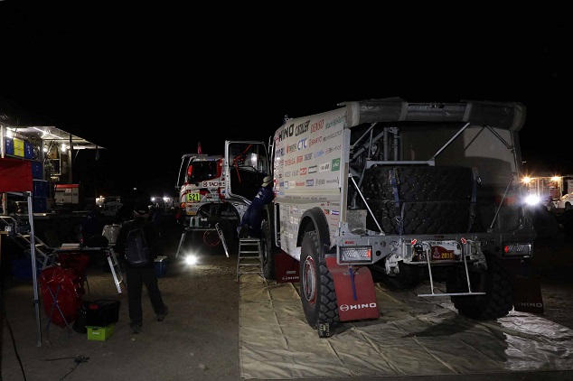 夜になって冷え込んできたアレキパのビバークで整備作業を進める日野チームスガワラ