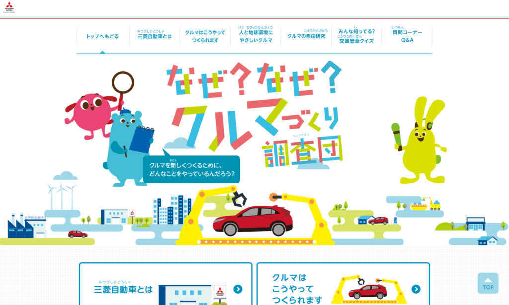 また、こどもたちの学習ツールとして、「なぜ?なぜ?クルマづくり調査団」と題した、こども向けパンフレットの配布や、ウェブサイトを常時開設している。