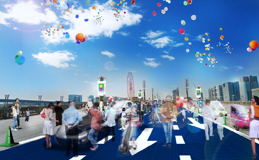 青海と有明を結ぶ全長1.5kmにわたるモーターショーのシンボルロード「OPEN ROAD」。最新の小型モビリティーに乗ったり、普段見ることのできない陸・海・空、様々なモビリティーをご覧頂くことができる。