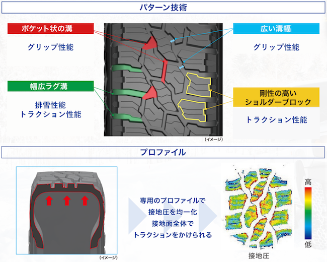 専用のパターンでは、ポケット状の広い空間の溝を配列することで雪を掴みながら優れたグリップ性能を発揮。また、幅広のラグ溝と剛性の高い大型のショルダーブロックにより、高いトラクション性能を実現した。さらに専用のプロファイルで接地圧を均一化することで、接地面全体で高い駆動力を発揮できる等、深雪でも走り切れる技術を搭載する。